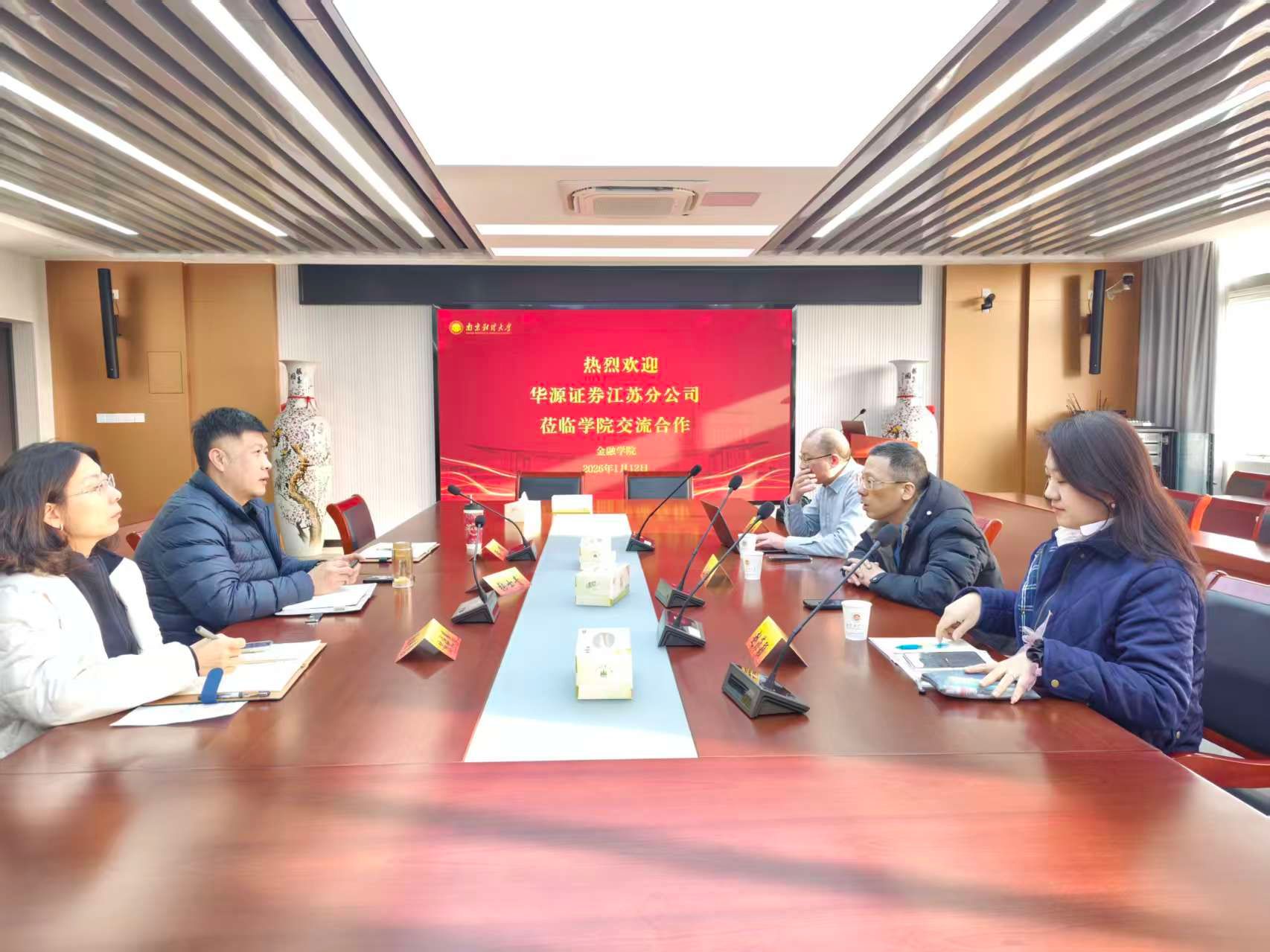 1月12日,华源证券江苏分公司总经理彭洪斌、副总经理赵菲颖、人力资源总监万佳海一行到访南京财经大学金融学院,双方就深化校企合作事宜开展座谈交流。金融学院党委副书记张士青、副院长陈晓慧、学工办主任黄炜出席交流会。交流会上,彭洪斌总经理详细介绍了华源证券的发展历程、业务布局及江苏分公司的运营规模,重点阐述了企业在金融服务领域的实践经验与发展规划,并表达了与学院建立深度合作关系、实现资源互补的意愿。张...