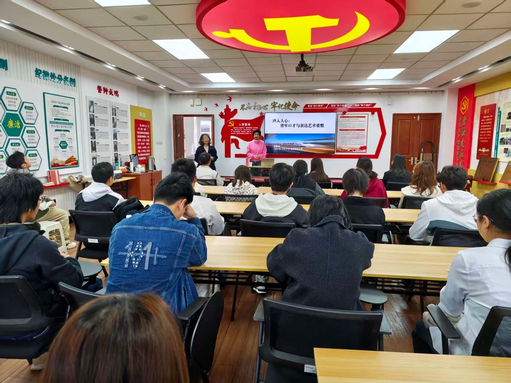 在实践教学环节,陈老师重点讲解了“内三外四”语言表达技巧,包括情景再现、内在语、对象感,以及重音、停连、语气、节奏等核心要素。通过绕口令、情景语句朗读等丰富多样的互动练习,让学生在实战中感受语言表达的独特魅力,现场气氛热烈,掌声不断。